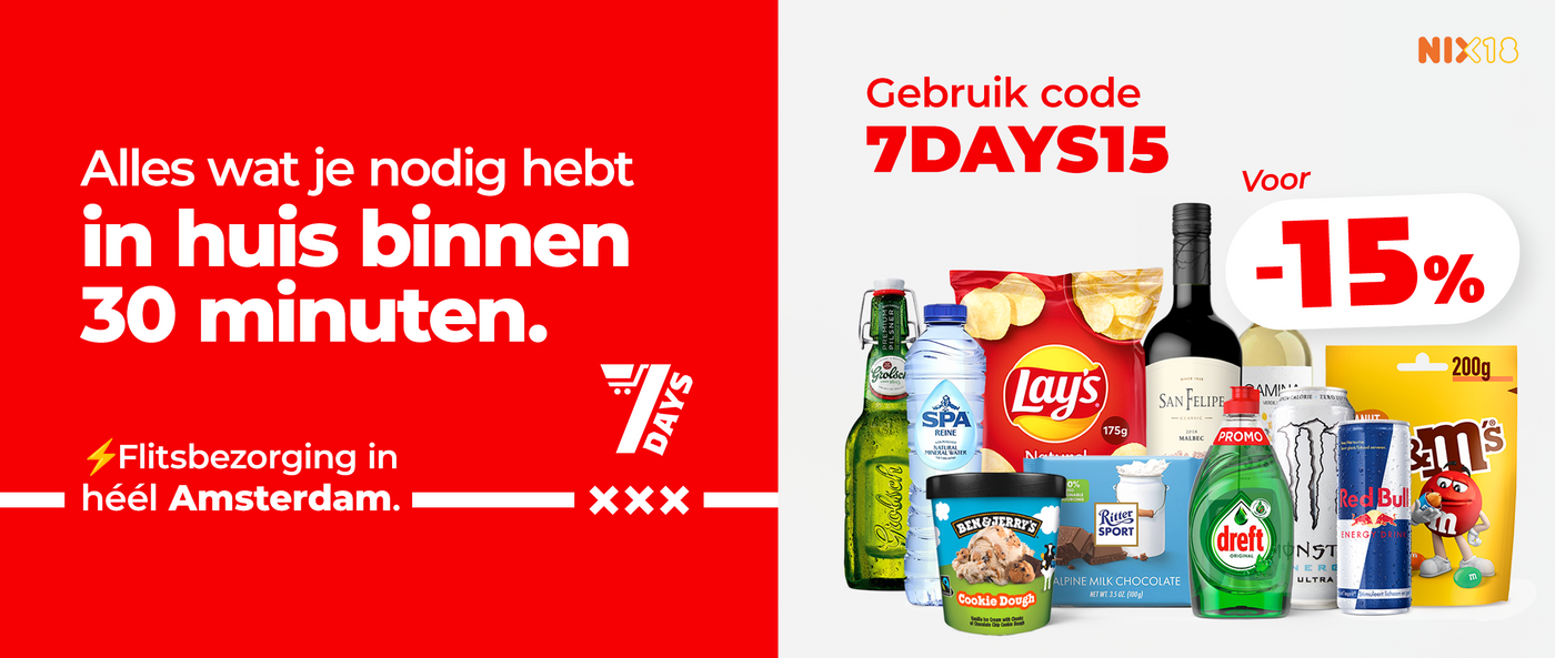 Drank op? Geen snacks meer? Niks meer om te rollen en het is al middernacht? Geen paniek. Wij bezorgen alles wat je nodig hebt, precies wanneer je het nodig hebt. Van ijskoude biertjes, sterke drank en mixers tot snoep, chips en daily essentials - 7DAYS staat voor je deur, waar je ook bent in Amsterdam.